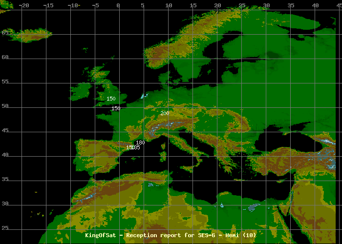 2015-08-09 19:24:55joselolo20042 (42.1N-8.3W,200cm) ? Galicia y Norte de España cual es el tamaño de Antena y Recepcion del (Ses-6 40W).Mi situacion es:8.3W/42.1N .- Un saludo.